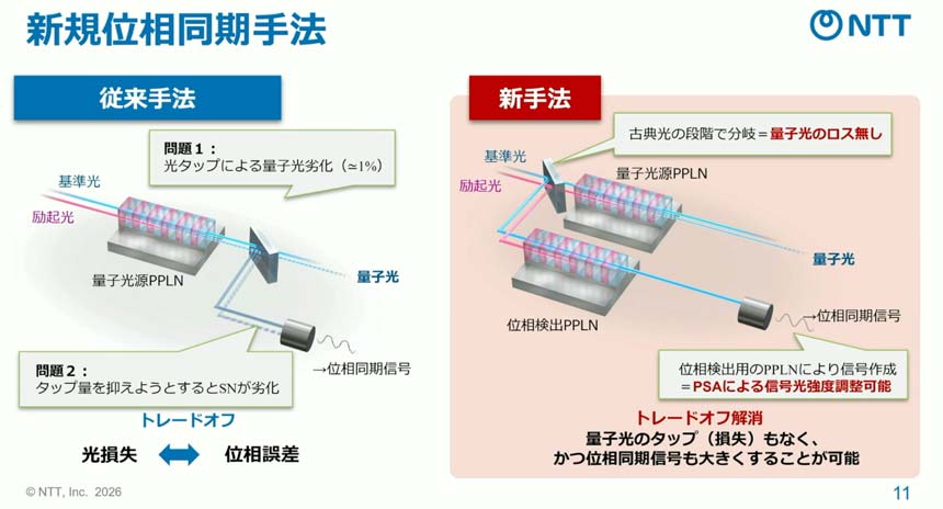 この構成により、量子光源PPLNから出力されるスクイーズド光側からはタップを行わずに済むため、スクイーズド光の損失・劣化を抑えられる。また、位相検出用PPLN内のパラメトリック増幅器を用いることで、光の損失を伴わずに強い位相同期信号を生成できると柏崎氏は説明した。