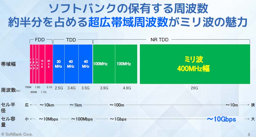 ミリ波は直進性が高く、電波の届く範囲が限られるという課題があるが、テクノロジーユニット統括 無線ネットワーク開発部 担当部長の安藤高任氏は、「ソフトバンクが保有する周波数帯の約半分を占める400MHzの広帯域を使える」点がミリ波の強みだと述べ、「ミリ波を活用しない手はない」と強調した。