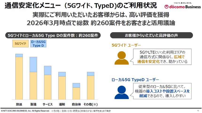 5Gワイドとローカル5G TypeDの利用状況についても説明もあった。内訳は非公開とのことだが、両者の案件数は合計で260件にのぼり、「うち約3割を受注している状況」だと岩本氏は話した。