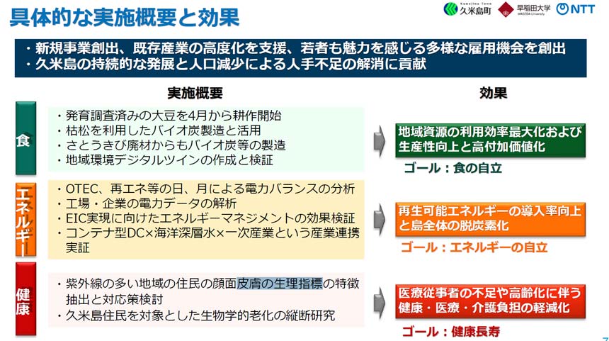 そのほか、再エネの発電・消費・蓄電の状況を統合的に制御・管理してエネルギーの自立運用を目指す「Energy Informatics Cell」の実証や、枯松やさとうきび廃材を利用したバイオ炭の製造、住民の皮膚の健康状態や老化に関する分析・研究などにも取り組む。