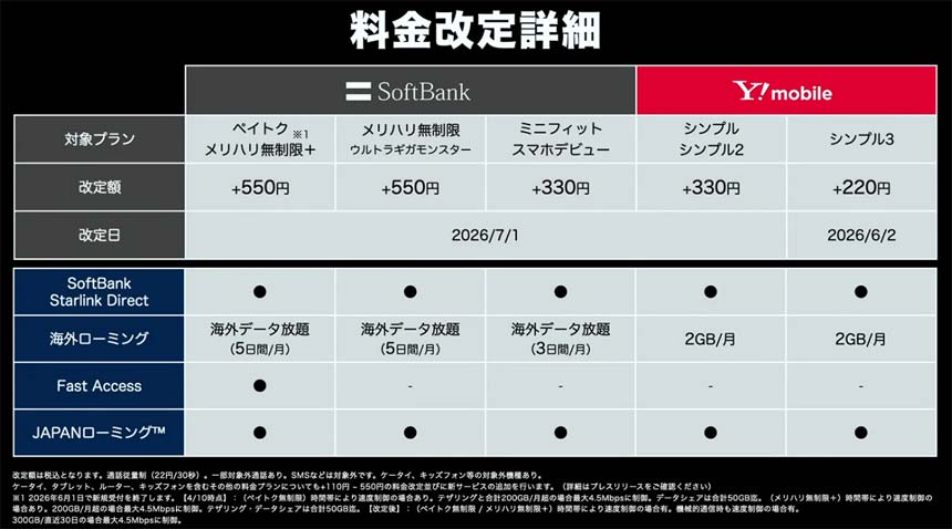 また、料金プランの値上げも発表。ソフトバンクの既存プランは7月1日、ワイモバイルは6月2日より順次料金改定を実施する。