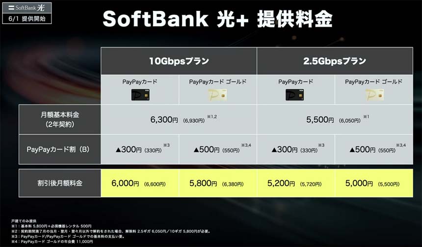 新たな光ブロードバンドサービス「SoftBank光+」も6月1日より提供開始する。1/2.5/10Gbpsの3プランを用意し、PayPayカード ゴールドのユーザーであれば、1/2.5Gbpsプランは月額5500円(▲550円)、10Gbpsプランは月額6380円(▲550円)で利用可能だ。