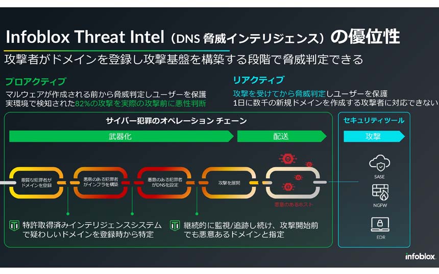 その中核を担うのが、同社の「Infoblox Threat Intel」(DNS脅威インテリジェンス)だ。長年蓄積してきたDNSデータをもとに、攻撃者がドメインを登録した段階からそのドメインを継続監視する「プロアクティブ型」のアプローチを取る。その結果、「実環境で検知された攻撃の82%を、実際に攻撃が始まる前に悪性と判定できている」(土橋氏)という。