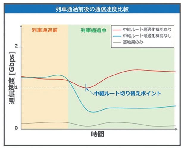 さらに、駅のホームは列車の往来や混雑状況によって通信環境が大きく変化する。そのような環境下でもミリ波中継器が常に最適なルートを選択して電波を中継することで、1Gbpsを超える通信速度を、安定して維持できることを確認した(図表6)。
