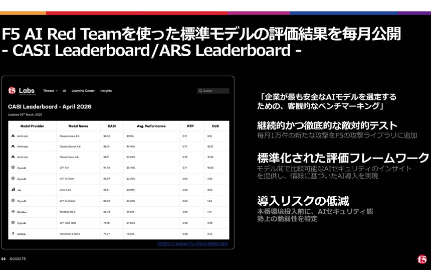 F5によるCalypsoAI(カリプソAI)の買収を契機に誕生したもので、AIモデルの脆弱性を検査するテストツール「F5 AI Red Team」による結果をもとに、F5の脅威インテリジェンス専門チーム「F5 Labs」が、攻撃プロンプトに対するモデルの脆弱性を測定する「CASI」と、モデルの耐性を測る「ARS」の2つの指標を、標準化されたベンチマークとして月次で公開するという。
