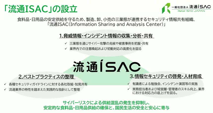 流通業界ではデジタル技術を活用したDXが進展する一方で、サイバー攻撃も増加・巧妙化の一途をたどっている。こうしたサイバーリスクに起因する供給混乱を未然に防ぎ、食料品・日用品の安定供給と国民生活の安心・安全を支えることが、流通ISAC設立の目的だという。