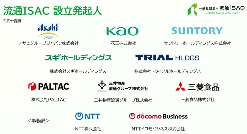 流通ISACには、アサヒグループジャパン、トライアルホールディングス、三菱食品に加え、花王、サントリーホールディングス、スギホールディングス、PALTAC、三井物産流通グループの8社も加盟。事務局はNTTとNTTドコモビジネスが務め、経済産業省もオブザーバーとして参画する予定だ。