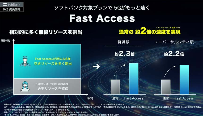Fast Accessは、ソフトバンクの料金プランを契約するユーザーが利用する5G通信に対して、多くの無線リソースを割り当てることで、混雑している場所や時間帯でも、より高速な5Gデータ通信を可能になるサービス。Fast Accessを活用することで、舞浜駅やユニバーサルシティ駅では、従来比2倍以上の通信速度を実現できることを確認したという。