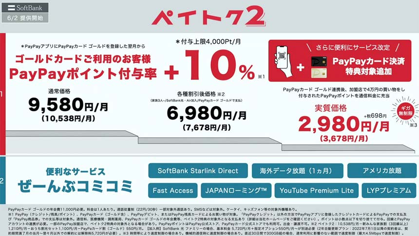 6月2日には、このSoftBank Starlink Directなどをセットにした新料金プラン「ペイトク2」を提供開始する。また、同プランでは混雑時でも快適な通信を実現する「Fast Access」もバンドルされる。
