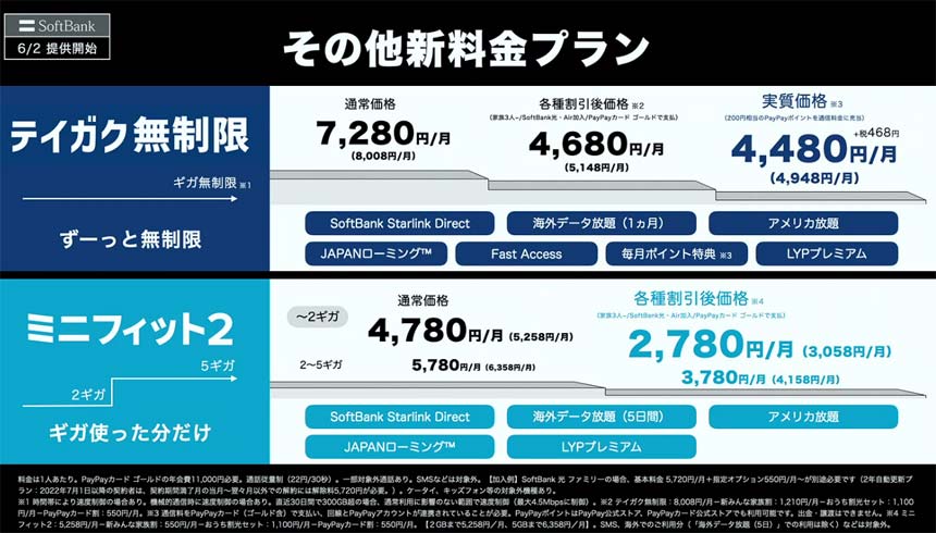 加えて、SoftBank Starlink Direct等をバンドルした無制限プラン「テイガク無制限」、データ使用量に応じて料金が決まる「ミニフィット2」も6月2日より提供をスタートする。テイガク無制限の基本料金は8008円で、各種割引やポイント還元の適用により実質4948円となる。ミニフィット2の基本料金は5258円だが、各種割引によって実質3058円(2ギガ未満の場合)で利用できる。