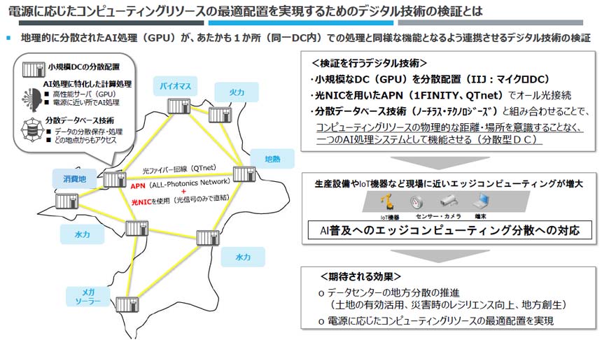 今回の実証プロジェクトでは、再エネが豊富な九州各地に設置した小規模DCをオール光ネットワークで接続し、1つの巨大なコンピューティングリソースを構築することで、「九州版ワット・ビット連携」の実現を目指す。