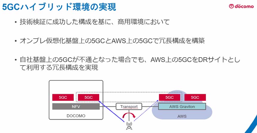 具体的には、オンプレミスの仮想化基盤とAWS上に5GCを構築する冗長構成を取る。これにより、オンプレ側の5GCが不通になった場合でも、AWS側をDRサイト(代替拠点)として機能させることでサービスを継続できるようになったという。