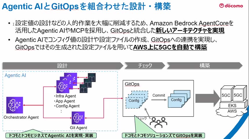 また、NTTドコモとNTTドコモビジネスは、AIエージェントとGitOpsを活用して5GCを自動設計・構築する実証に成功した。従来の5GCの設計・構築には、「100以上のドキュメントを参照しなければならず、数多くの複雑な設定ファイルの作成・修正も必要。そこに多くの人手と期間がかかっていた」(説明員)が、この課題を解決する。