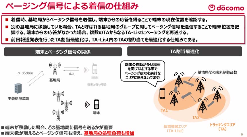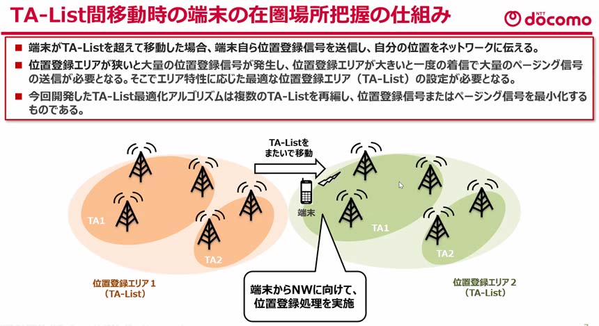 NTTドコモ R&D戦略部の福田修之氏によれば、携帯電話がネットワークに接続し、いつでも着信できる状態を維持するためには、「TA(トラッキングエリア)」「TA-List」と呼ばれる2つの概念が不可欠だ。