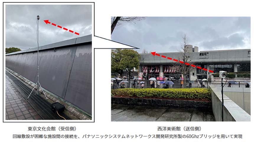 また、今回の実用テストでは、公演会場の1つである国立西洋美術館の地下ホールにて行われた公演映像の伝送に60GHz帯無線を活用。60GHz帯無線は、高速通信が可能で電波干渉が少なく、免許も不要という特徴を持つ。国立西洋美術館は、文化財や建物保護の観点から配線工事に制限があり、有線ネットワークの構築が困難だったが、60GHz帯無線の活用によってこうした課題を解決できたとしている。
