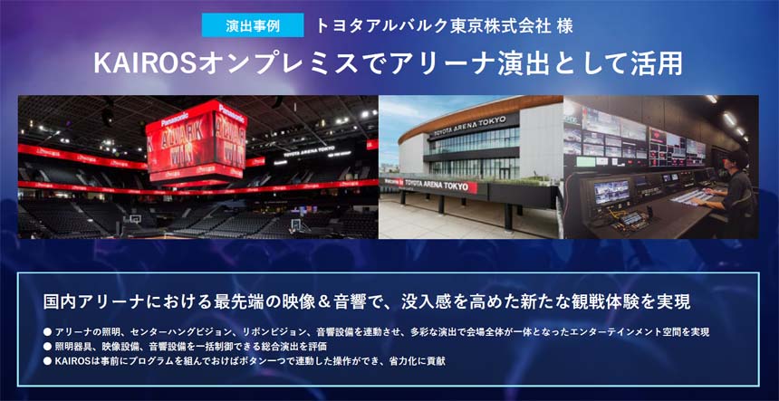 例えば、多目的アリーナ「TOYOTA ARENA TOKYO」がKAIROSオンプレを導入。多彩な演出で会場全体が一体となったエンタメ空間を再現でき、アリーナの照明やセンターハングビジョン、リボンビジョン、音響設備などを連携・一括制御するためにKAIROSを活用しているという。