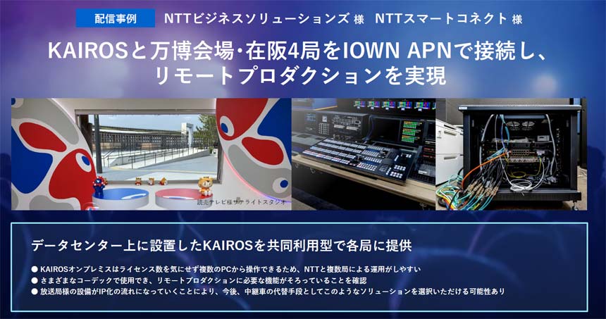 また、大阪・関西万博では、NTT西日本のデータセンターにKAIROSの中核を担うメインフレーム「Kairos Core 200」を設置し、データセンター・万博会場・在阪放送局をIOWN APN(オールフォトニクス・ネットワーク)で接続するリモートプロダクションを実施した。