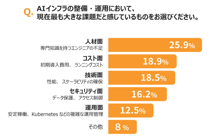 一方で、導入・運用上の課題としては「人材面」が25.9%で最多となり、「コスト面」18.9%、「技術面」18.5%、「セキュリティ面」16.2%が続いた。運用面では、AIインフラのリソース効率に「満足していない」「どちらともいえない」とした企業が53.0%に達し、GPUなどAIアクセラレーターの利用状況を十分に把握できていない企業も26.8%あった。さらに、Kubernetesなどコンテナオーケストレーション基盤を本番環境で使いこなせていると回答した企業は16.6%にとどまり、AIインフラをPoCから実運用に移行する際の課題が浮き彫りになったとしている。