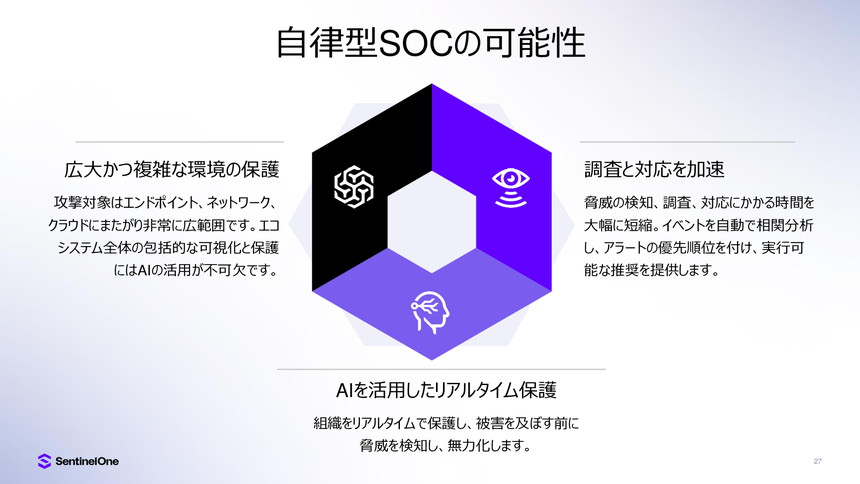 こうした課題を、同社はAIを中核に据えた自律型SOC(Security Operations Center)プラットフォームによって解決しようとしている。自律型SOCとは、AIを活用してオペレーションを自動化し、「組織における脅威の調査やレスポンスを短縮し、イベントの相関分析やアラートの優先順位付けを行う」(同社 マーケティング担当 シニアバイスプレジデントのブライアン・ゲイル氏)という考え方だ。