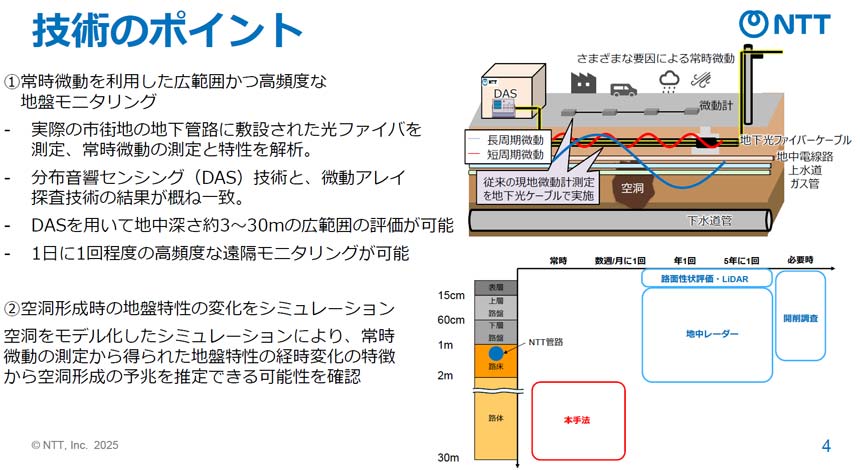こうした道路陥没事故を防ぐため、現在も地中レーダーや超音波などを用いた地中空洞調査が行われているが、「現地への人員派遣が必要で、道路も一時的に封鎖しなければならず、高い頻度での点検が難しい。調査できる深度も地表から3m未満と限定的だ」とNTTアクセスサービスシステム研究所 アクセス運用プロジェクト 主任研究員の飯田大輔氏は指摘した。