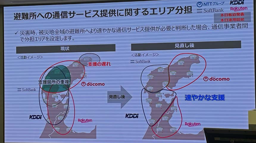 NTT技術企画部門 災害対策室長の倉内努氏によれば、「これまでは各社が独自の判断で充電設備や通信サービスなどを避難所に提供してきたが、支援内容が重複するうえ、その分他地域への対応が遅れることもあった」という。通信事業者間でエリア分担を行うことで、迅速かつ広範囲な避難所支援を目指すとした。