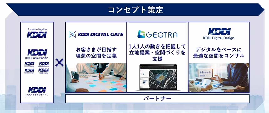コンセプト策定では、5GやIoTなどに精通した専門スタッフによるコンサルティングに加え、KDDIと三井物産の合弁会社であるGEOTRAが提供する位置情報ビッグデータ分析・可視化ツールを活用する。人々の行動データをもとに、「ビルの入口をどこに設けるべきかといった立地提案・空間づくりを支援できる」と那谷氏はアピールした。