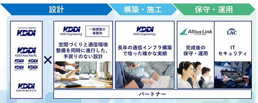 こうした課題を解決するため、「テクノロジーを起点に理想の空間を提案する」空間設計サービスを提供する。KDDI Smart Space Designでは、空間コンセプトの策定からレイアウト設計、ビルの構築・施工、運用・保守までを一気通貫でサポートする。