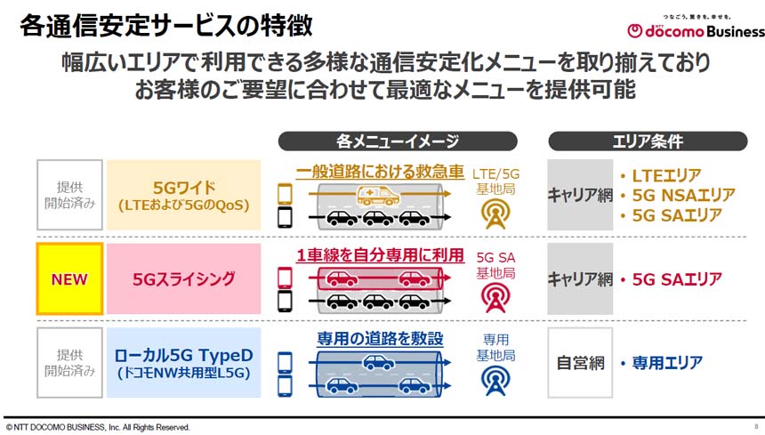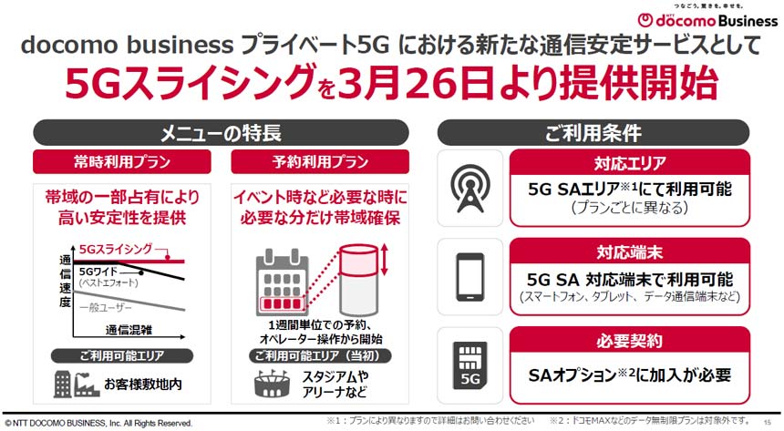 5Gスライシングは、ネットワークの一部帯域を仮想的に分割し、目的や用途に応じて専用のスライスを提供するソリューション。「常時利用プラン」と「予約利用プラン」の2種類を用意し、5G SA(Stand Alone)対応端末で利用可能となっている。