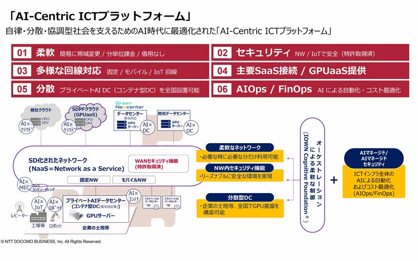 3つ目として、固定、モバイル、IoT回線に加え、エッジコンピューティングにも対応する多様な回線対応を実現。4つ目は、主要クラウドサービスに接続済みで、今後はクラウドベースでGPUサービスも提供する予定だ。5つ目として、コンテナ型DCによる分散型データセンターにより、顧客拠点や地方への設置を簡単にでき、液冷対応によりAI需要に柔軟に対応できるとしている。そして6つ目は、AIOps/FinOpsによりICT環境全体の運用自動化とコスト最適化を実現するという。これらの機能は、NTTグループのIOWN技術とも連携しているとのことだ。