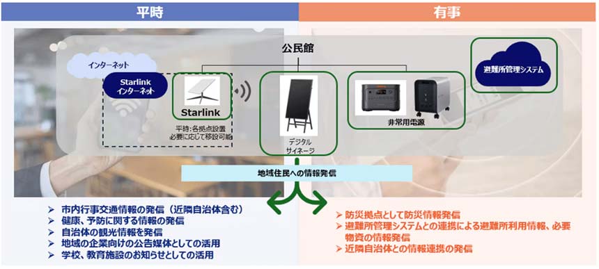 避難所における被災者の情報収集や避難者名簿の作成をデジタルで実施できる「避難所管理システム」もあわせて導入し、平時にも有事に備えた避難所マップを提供する。また、サイネージを稼働させ、平時は市内行事交通情報や自治体からのお知らせを配信し、有事は防災情報や避難所管理システムと連携した必要物資の情報などの発信を行っていくとしている。