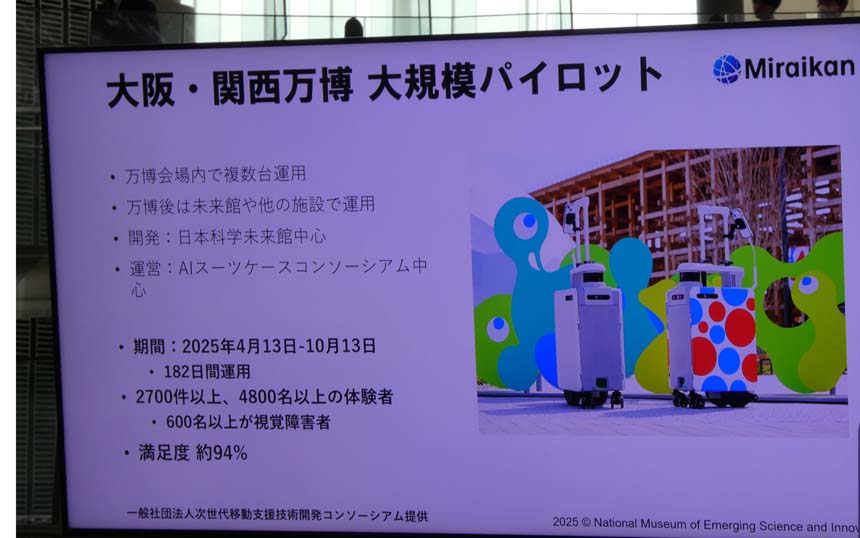 日本科学未来館 副館長の高木啓伸氏は、視覚障害者の自由な移動をナビゲーションする「AIスーツケース」の取り組みを紹介した。「ハンドルを持って歩くだけの設計で、人間工学的に歩きやすく、前にある障害物や段差を検知でき、街中でも目立ちにくい」。大阪・関西万博での実証実験では600名以上の視覚障害者が体験し、満足度94%を達成。万博で得られたフィードバックを反映し、他施設への展開も視野に入れているという。
